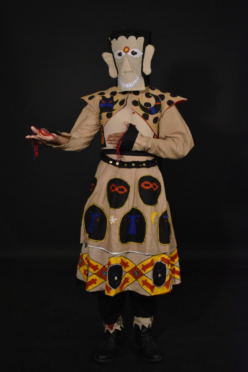 Mask development through paper and making by hand. Neutral beiges are used as the base for the overall layers of the costume in various shades, enabling the motifs and symbols to stand out.​